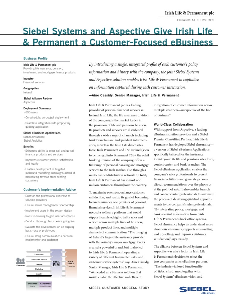 deep eBusiness experience, made of financial products and services tailored Siebel eInsurance, Irish Life & Permanent’s