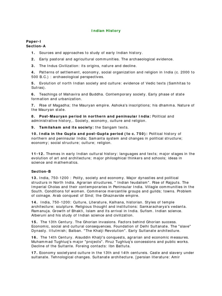 Khusrau, Historiography; Ziya Barani. Evolution of a composite culture. Sufism in North India. Lingayats. Bhakti schools in the south. 18. The 15th and early16th Century (Political History). Rise of Provincial Dynasties: Bengal, Kashmir (Zainul Abedin), Gujarat, Malwa, Bahmanids. The Vijayanagra Empire. Lodis. Mughal Empire, First phase : Babur, Humayun. The Sur Empire : Sher Shah's administration. The Portuguese colonial enterprise. 19. The 15th and early 16th Century (society, economy and culture). Regional cultures and literatures. provincial architectural styles. Society, culture, literature and the arts in Vijayanagara Empire. Monotheistic movements: Kabir and Guru Nank. Bhakti Movements: Chaitanya. Sufism in its pantheistic phase. 20. Akbar: His conquests and consolidation of empire. Establishment of jagir and mansab systems. His Rajput policy. Evolution of religious and social outlook. Theory of Sulh-i-kul and religious policy. Abul Fazl, thinker and historian. Court patronage of art and technology. 21. Mughal empire in the 17th Century. Major policies (administrative and religious) of Jahangir, Shahjahan and Aurangzeb. The Empire and the Zamindars. Nature of the Mughal state. Late 17th Century crisis: Revolts. The Ahom kingdom, Shivaji and the early maratha kingdom. 22. Economy and society, 16th and 17th Centuries. Population. Agricultural and craft production. Towns, commerce with Europe through Dutch, English and French companies- a "trade revolution". Indian mercantile classes. Banking, insurance and credit systems. Conditions of peasants, famines. Condition of Women. 23. Culture during Mughal Empire. Persian literature (including historical works). Hindi and relgious literatures. Mughal architecture. Mughal painting. Provincial schools of architecture and painting. Classical music. Science and technology. Sawai Jai Singh, astronomer. Mystic eclecticism : Dara Shukoh. Vaishnav Bhakti. Mahrasthra Dharma. Evolution of the Sikh community (Khalsa). 24. First half of 18th Century: Factors behind decline of the Mughal Empire. The regional principalities (Nizam's Deccan, Bengal, Awadh). Rise of Maratha ascendancy under the Peshwas. The Maratha fiscal and financial system. Emergency of Afghan Power. Panipat, 1761. Internal weakness, political cultural and economic, on eve of the British conquest. Paper-II Section-A 1. Establishment of British rule in India: Factors behind British success against Indian powers- Mysore, Maratha Confederacy and the Punjab as major powers in resistance; Policy of subsidiary Alliance and Doctrine of Lapse. 2. Colonial Economy : Tribute system. Drain of wealth and "deindustrialisation", Fiscal pressures and revenue settlements (Zamindari, Ryotwari and Mahalwari settlements); Structure of the British raj up to 1857 (including the Acts of 1773 and 1784 and administrative organisation). 3. Resistance to colonia rule : Early uprisings; Causes, nature and impact of the Revolt of 1857; Reorganisation of the Raj, 1858 and after.