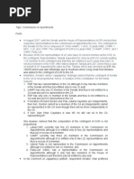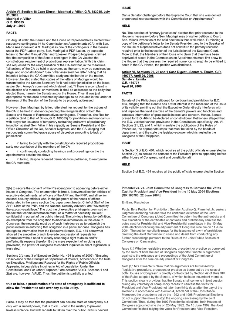 Can a Senator challenge before the Supreme Court that she was denied proportional representation with the Commission on Appointments? HELD No. The doctrine of "primary jurisdiction" dictates that prior recourse to the House is necessary before Sen. Madrigal may bring her petition to Court. Sen. Villar's invocation of the said doctrine is thus well-taken. Furnishing a copy of the petitioner's letter to the Senate President and to the Speaker of the House of Representatives does not constitute the primary recourse required prior to the invocation of the jurisdiction of the Supreme Court. More to that, the Members of the House who claim that they have been deprived of a seat in the Commission on Appointments must first show to the House that they possess the required numerical strength to be entitled to seats in the CA. Hence, the petition was dismissed. Article VI, Sections 21, 22 and 1 Case Digest - Senate v. Ermita, G.R. 169777, April 20, 2006 Senate v. Ermita G.R. 169777 April 20, 2006 FACTS Senate of the Philippines petitioned for certiorari and prohibition for E.O. 464, alleging that the Senate has a vital interest in the resolution of the issue of its validity, pointing out that the Executive Order directly interferes with and impedes the valid exercise of the Senate's powers and functions and conceals information of great public interest and concern. Hence, Senate prayed for E.O. 464 to be declared unconstitutional. Petitioners alleged that the E.O. violated various provisions in the Constitution, specifically, Art. VI, Sections 21, 22, and 1, which mandate the publication of the Rules of Procedure, the appropriate steps that must be taken by the heads of department, and the state the legislative power which is vested in the Congress of the Philippines. ISSUE Is Section 3 of E.O. 464, which requires all the public officials enumerated in Section 2(b) to secure the consent of the President prior to appearing before either House of Congress, valid and constitutional? HELD Section 3 of E.O. 464 requires all the public officials enumerated in Section