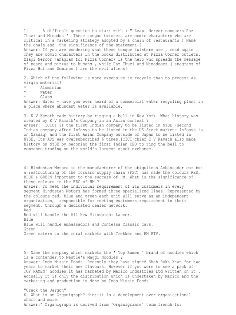 5) Name the company which markets the ' Top Ramen ' brand of noodles which is a contender to Nestle's Maggi Noodles ? Answer: Indo Nissin Foods. Recently they have signed Shah Rukh Khan for two years to market their new flavours. However if you were to see a pack of ' TOP RAMEN' noodles it has marketed by Marico Industries Ltd written on it . Actually it is only the distribution which is undertaken by Marico and the marketing and production is done by Indo Nissin Foods "Crack the Jargon" 6) What is an Organigraph? Hint:it is a development over organisational chart and more. Answer:" Organigraph is derived from 'Organigramme' term french for