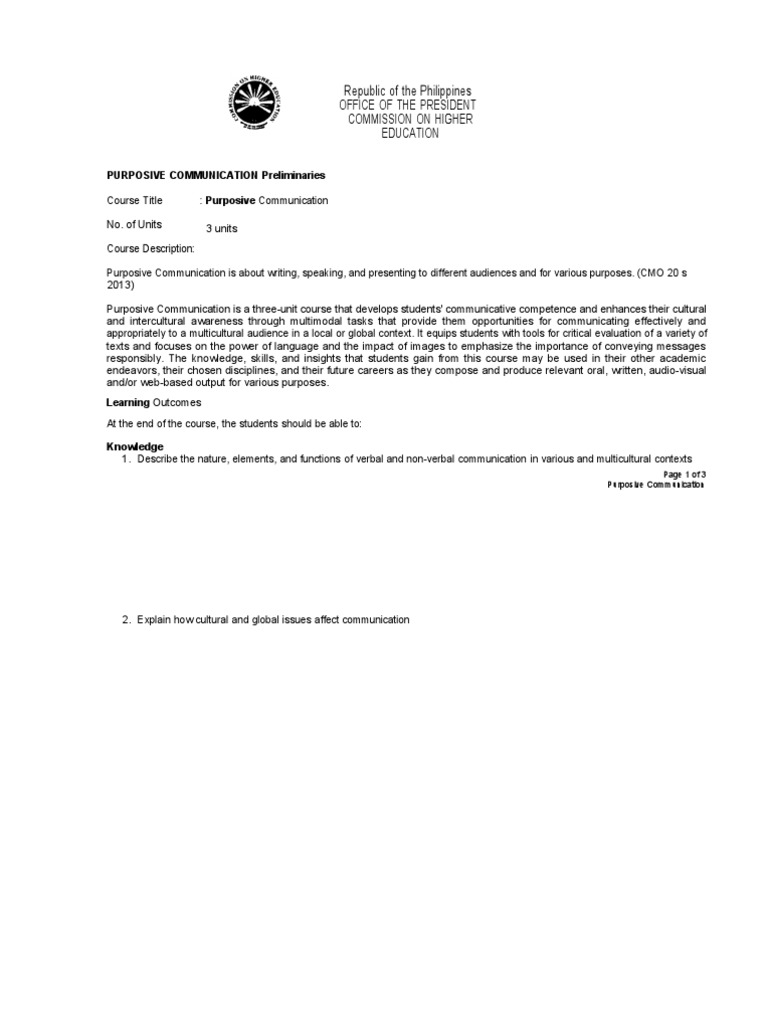 Purposive Communication is a three-unit course that develops students' communicative competence and enhances their cultural