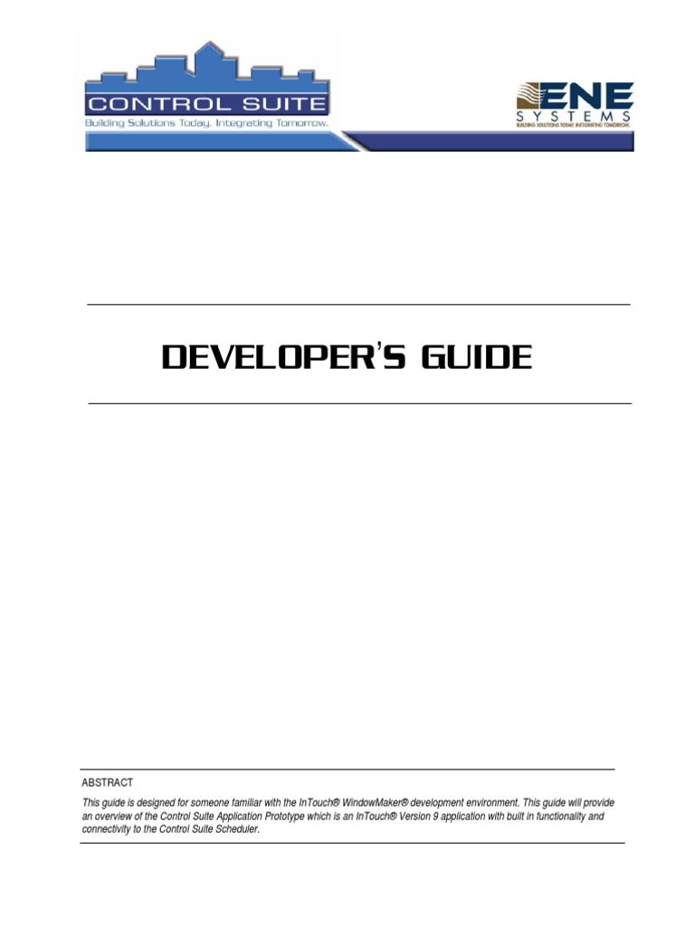 ABSTRACT This guide is designed for someone familiar with the InTouch WindowMaker development environment. This guide will provide an overview of the Control Suite Application Prototype which is an InTouch Version 9 application with built in functionality and connectivity to the Control Suite Scheduler.