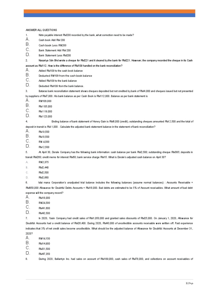 5. At April 30, Dorale Company has the following bank information: cash balance per bank RM2,500; outstanding cheque RM385; deposits in
