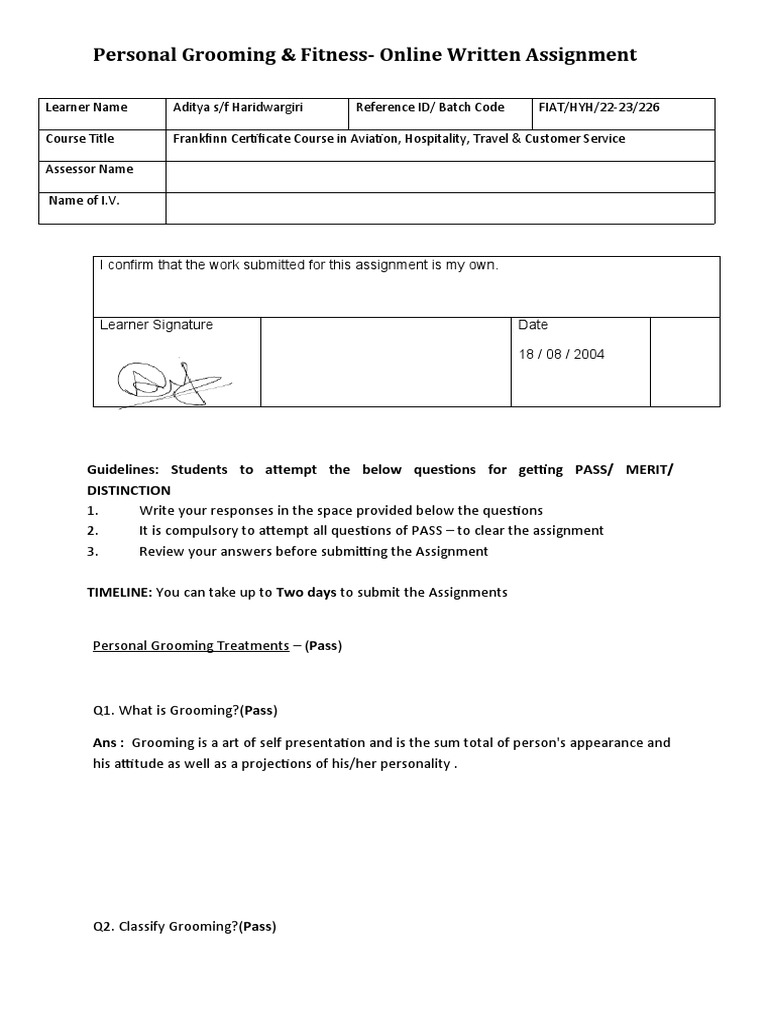 Learner Name Aditya s/f Haridwargiri Reference ID/ Batch Code FIAT/HYH/22-23/226