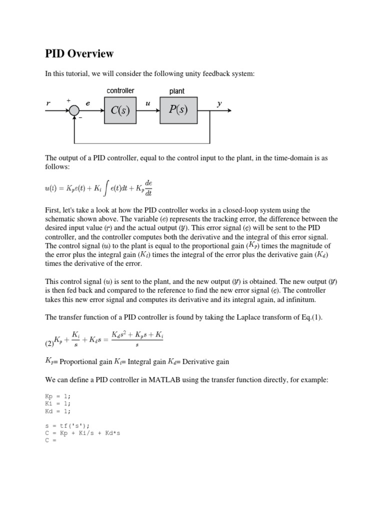 The transfer function of a PID controller is found by taking the Laplace transform of Eq.(1).