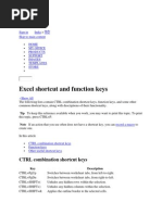 Description CTRL+( Unhides any hidden rows within the selection. CTRL+) Unhides any hidden columns within the selection. CTRL+& Applies the outline border to the selected cells. CTRL+_ Removes the outline border from the selected cells. CTRL+~ Applies the General number format. CTRL+$ Applies the Currency format with two decimal places (negative numbers in parentheses). CTRL+% Applies the Percentage format with no decimal places. CTRL+^ Applies the Exponential number format with two decimal places. CTRL+# Applies the Date format with the day, month, and year. CTRL+@ Applies the Time format with the hour and minute, and AM or PM. CTRL+! Applies the Number format with two decimal places, thousands separator, and minus sign (-) for negative values. CTRL+- Displays the Delete dialog box to delete the selected cells. CTRL+* Selects the current region around the active cell (the data area enclosed by blank rows and blank columns). In a PivotTable, it selects the entire PivotTable report. CTRL+: Enters the current time. CTRL+; Enters the current date. CTRL+` Alternates between displaying cell values and displaying formulas in the worksheet. CTRL+' Copies a formula from the cell above the active cell into the cell or the Formula Bar. CTRL+" Copies the value from the cell above the active cell into the cell or the Formula Bar. CTRL++ Displays the Insert dialog box to insert blank cells. CTRL+1 Displays the Format Cells dialog box. CTRL+2 Applies or removes bold formatting. CTRL+3 Applies or removes italic formatting. CTRL+4 Applies or removes underlining. CTRL+5 Applies or removes strikethrough. CTRL+6 Alternates between hiding objects, displaying objects, and displaying placeholders for objects. CTRL+7 Displays or hides the Standard toolbar. CTRL+8 Displays or hides the outline symbols. CTRL+9 Hides the selected rows. CTRL+0 Hides the selected columns. CTRL+A Selects the entire worksheet. If the worksheet contains data, CTRL+A selects the current region. Pressing CTRL+A a second time selects the entire worksheet. When the insertion point is to the right of a function name in a formula, displays the Function Arguments dialog box. CTRL+SHIFT+A inserts the argument names and parentheses when the insertion point is to the right of a function name in a formula. CTRL+B Applies or removes bold formatting. CTRL+C Copies the selected cells. CTRL+C followed by another CTRL+C displays the Microsoft Office Clipboard. CTRL+D Uses the Fill Down command to copy the contents and format of the topmost cell of a selected range into the cells below. CTRL+F Displays the Find dialog box. SHIFT+F5 also displays this dialog box, while SHIFT+F4 repeats the last Find action. CTRL+G Displays the Go To dialog box. F5 also displays this dialog box.