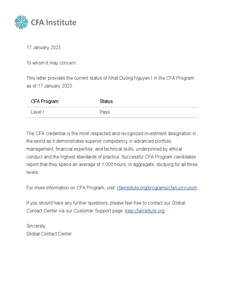 This letter provides the current status of Nhat Duong Nguyen I in the CFA Program