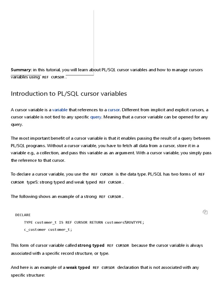 A cursor variable is a variable that references to a cursor. Different from implicit and explicit cursors, a