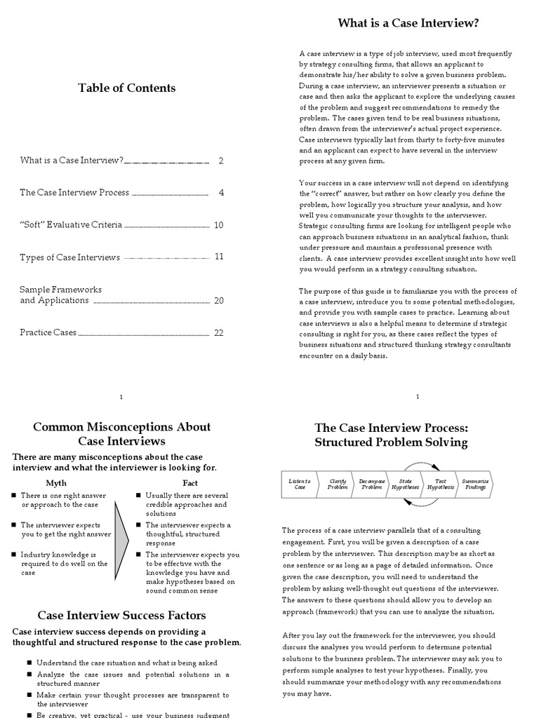A case interview is a type of job interview, used most frequently by strategy consulting firms, that allows an applicant to demonstrate his/her ability to solve a given business problem. During a case interview, an interviewer presents a situation or case and then asks the applicant to explore the underlying causes of the problem and suggest recommendations to remedy the problem. The cases given tend to be real business situations, often drawn from the interviewers actual project experience. Case interviews typically last from thirty to forty-five minutes and an applicant can expect to have several in the interview process at any given firm. Your success in a case interview will not depend on identifying the correct answer, but rather on how clearly you define the problem, how logically you structure your analysis, and how well you communicate your thoughts to the interviewer. Strategic consulting firms are looking for intelligent people who can approach business situations in an analytical fashion, think under pressure and maintain a professional presence with clients. A case interview provides excellent insight into how well you would perform in a strategy consulting situation. The purpose of this guide is to familiarize you with the process of a case interview, introduce you to some potential methodologies, and provide you with sample cases to practice. Learning about case interviews is also a helpful means to determine if strategic consulting is right for you, as these cases reflect the types of business situations and structured thinking strategy consultants encounter on a daily basis.