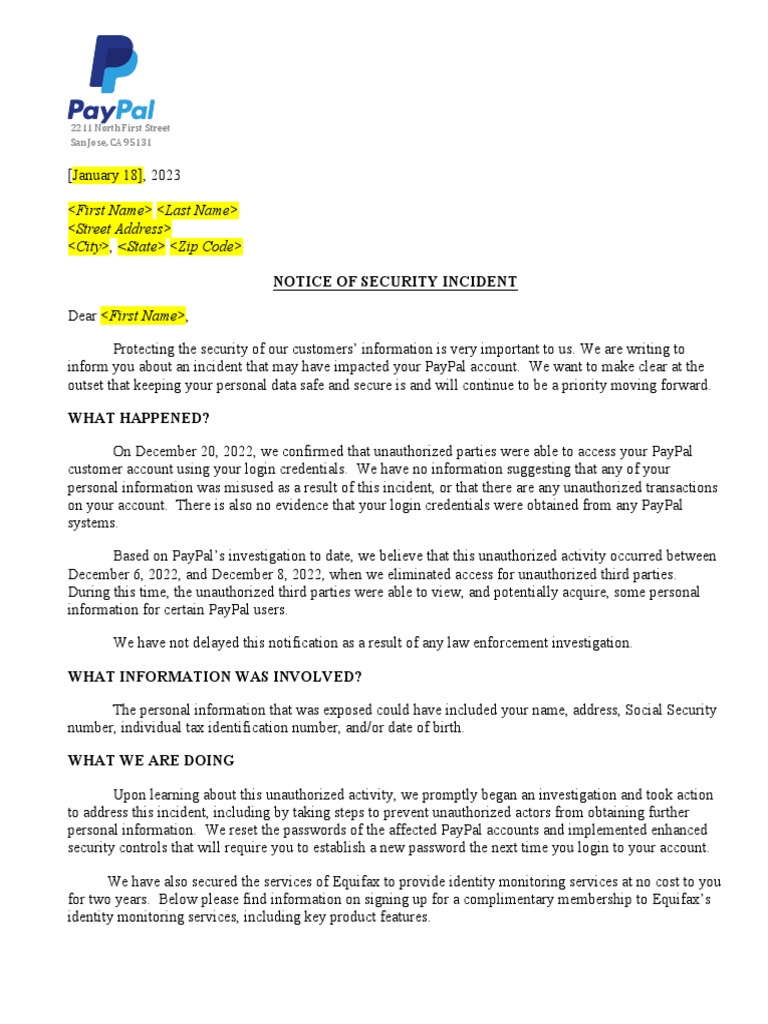 On December 20, 2022, we confirmed that unauthorized parties were able to access your PayPal