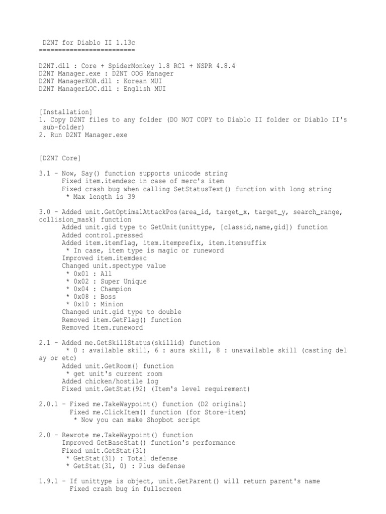 1.9 - Added unit.subareaid Added presetunit.areaid and presetunit.subareaid Added sdk\quests.txt Improved GetPath() and GetPresetUnits() function's stability Now Include() function's rootpath is "scripts" folder 1.8.5 - Fixed me.ClickItem() function (for SubmitItem()) Fixed Say() function in game 1.8.4 - Added SubmitItem() function (Imbue, Orifice, Add Sockets) * Item must be on cursor Fixed crash bug when calling GetPath() function Fixed Say() function in channel Improved GetBaseStat() function's performance Updated sdk\uiflag.txt information 1.8.3 - Supported ANSI/UTF-8/Unicode script Show correct Tal Rasha's tomb on automap Fixed wrong stash position in me.ClickItem() function (D2 original) Fixed unit.itemloc in case of equipped item 1.8.2 - Fixed crazy esc key 1.8.1 - Added me.revealautomap, me.showenemyonautomap, me.showmissileonautomap v ariables; Fixed crash bug when using maphack Fixed bug that displayed invalid unit on automap Fixed ClickMap() function Removed RevealAutoMap() function Removed ShowUnitOnAutomap() function 1.8 - Added RevealAutoMap() function Added SetStatusText() function Added ShowUnitOnAutomap() function Added unit.IsAttackable() function Added EVENT_GAMEMSG event Changed Cancel() function (0 : Cancel current menu, 1 : Cancel all menu) Rewrote ClickMap(), Say(), Transmute() functions Rewrote me.ClickItem(), me.ClickMercItem(), me.Repair(), me.SwapWeapons() functions Removed me.ShopItem() function. use me.ClickItem() Removed JS32.dll. D2NT.dll included SpiderMonkey 1.8 RC1 and NSPR 4.8 1.7.2 - Added me.maxgametime (default value is 0 and 0 is infinite) 1.7.1 - Added me.charloc Fixed multi-client when using one D2 copy 1.7 - Added unit.shrinetype (see sdk/shrines.txt) Improved ClickMap() function Removed SetStatusText() function Removed me.windowtitle Hook no longer D2's functions 1.6 - Improved GetPath() function (applied A* algorithm) Fixed crash bug when game is terminated by user Fixed unit.itemdesc 1.5 - Updated SpiderMonkey 1.8 Added unit.itemdesc