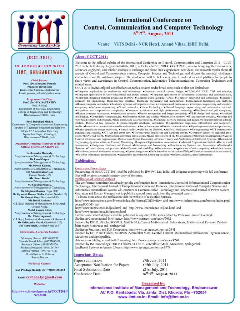 Website: http://www.interscience.ac.in/CCCT2011/ ccct.html