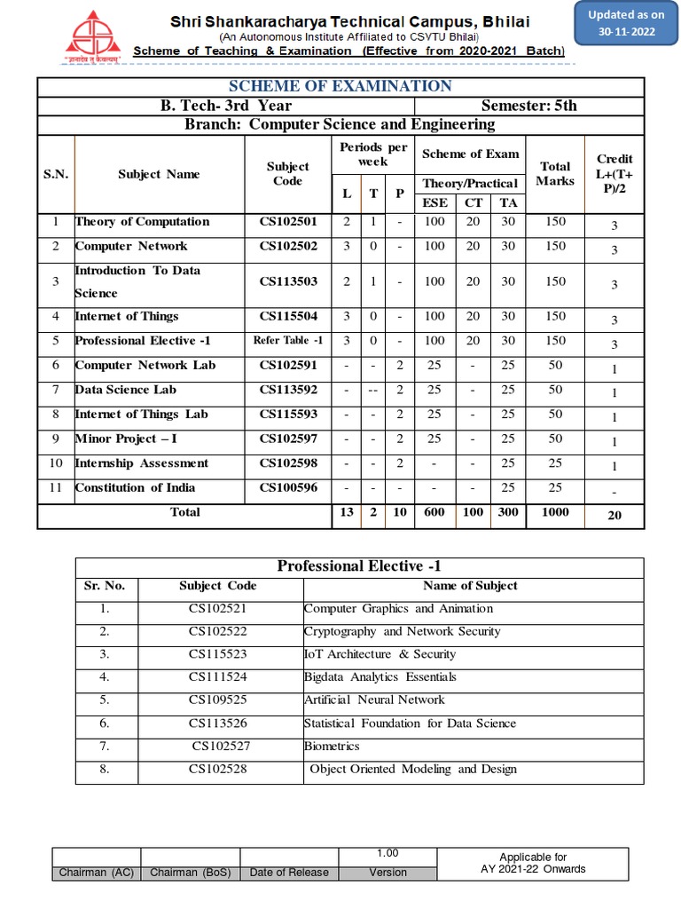 5 Professional Elective -1 Refer Table -1 3 0 - 100 20 30 150 3