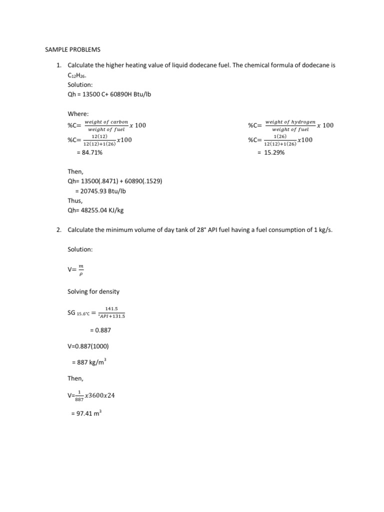 Solution: Qh = 13500 C+ 60890H Btu/lb Where: %C %C = 84.71% Then, Qh= 13500(.8471) + 60890(.1529) = 20745.93 Btu/lb Thus, Qh= 48255.04 KJ/kg 2. Calculate the minimum volume of day tank of 28 API fuel having a fuel consumption of 1 kg/s. Solution: V Solving for density SG 15..6C = 0.887 V=0.887(1000) = 887 kg/m3 Then, V= = 97.41 m3