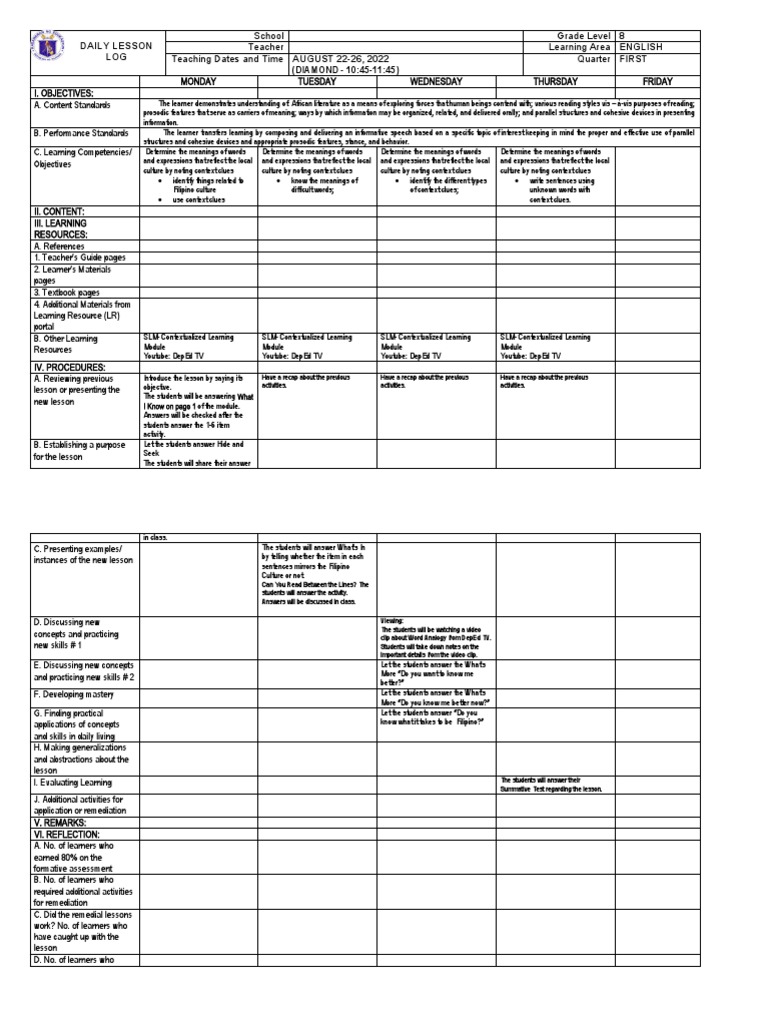 LOG Teaching Dates and Time AUGUST 22-26, 2022 Quarter FIRST