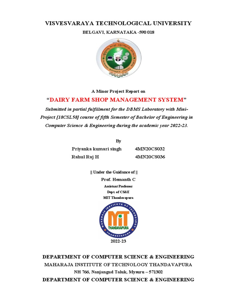 Certified that the minor project work entitled “DAIRY FARM SHOP