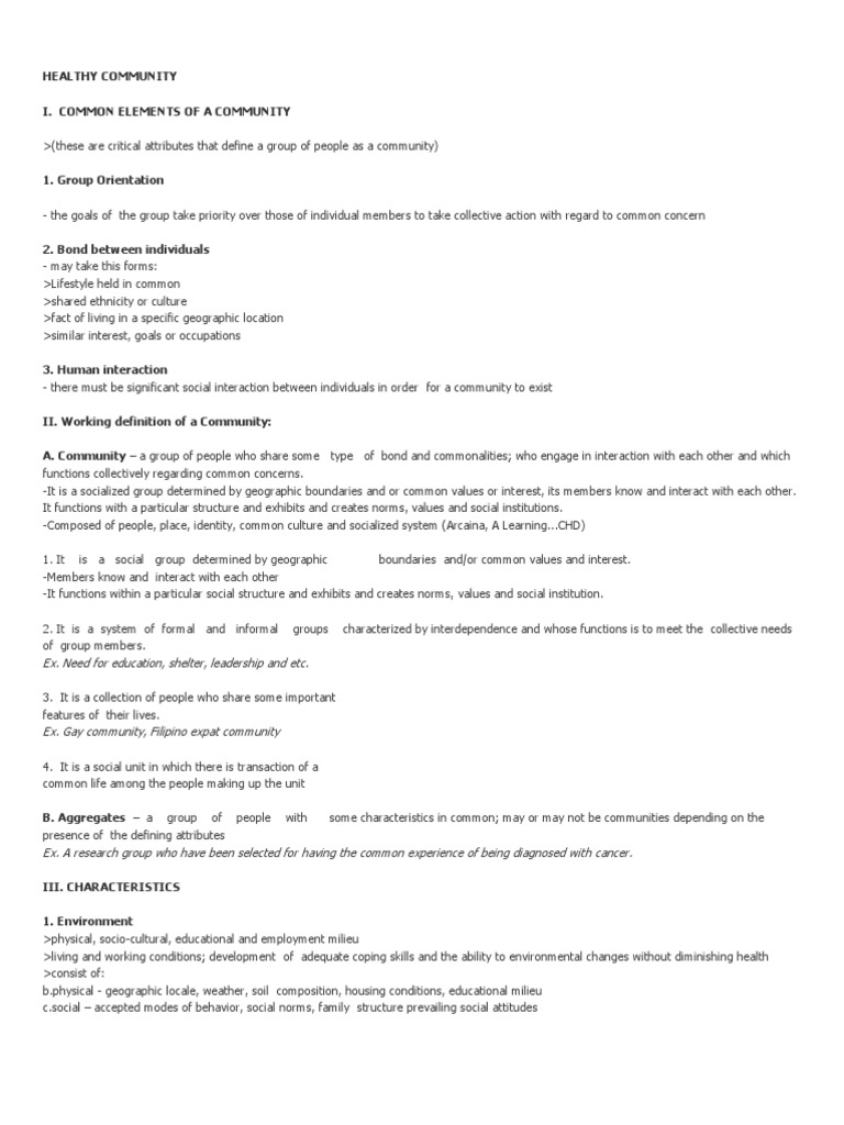 Group Orientation - the goals of the group take priority over those of individual members to take collective action with regard to common concern 2. Bond between individuals - may take this forms: >Lifestyle held in common >shared ethnicity or culture >fact of living in a specific geographic location >similar interest, goals or occupations 3. Human interaction - there must be significant social interaction between individuals in order for a community to exist II. Working definition of a Community: A. Community a group of people who share some type of bond and commonalities; who engage in interaction with each other and which functions collectively regarding common concerns. -It is a socialized group determined by geographic boundaries and or common values or interest, its members know and interact with each other. It functions with a particular structure and exhibits and creates norms, values and social institutions. -Composed of people, place, identity, common culture and socialized system (Arcaina, A Learning...CHD) 1. It is a social group determined by geographic boundaries and/or common values and interest. -Members know and interact with each other -It functions within a particular social structure and exhibits and creates norms, values and social institution. 2. It is a system of formal and informal of group members. groups characterized by interdependence and whose functions is to meet the collective needs