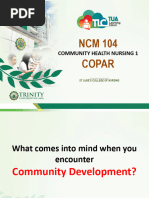 Principles of COPAR General: People, esp. the oppressed and exploited sectors are most open to change, have the capacity to change and are able to bring about change, Thus, CO should be based on the following: -Power must reside in the people -Development is from the people to the people -Peoples participation should always be present CO should be for the interest of the poorest sectors of the society; must be focused on collective organizations, planning and action. CO should lead to self-reliant communities WHEN THE PEOPLE LEAD, THE LEADERS FOLLOW Specific: Community participation = the active involvement of community members in decisions about how to improve the existing conditions or the mobilization of community people to take active part in the delivery of health services Reasons for CP: -to develop the capability of the people in solving problems -to let the people acquire a sense of commitment and ownership in the programs/projects implemented Phases of COPAR PRE-ENTRY PHASE Initial phase of the organizing process where the community organizer looks for communities to serve/help Simplest phase in terms of output, activities, strategies and time spent for it Criteria needed before going into the barangay = clear and simple Activities: 1. Site selection a. Depressed community with majority of the population belonging to the poor sector Household income below the national poverty threshold Lack of income opportunities b. Inaccessible / Inadequate health services Absence of barangay health station Lack of primary and secondary hospitals c. Poor health status high incidence of communicable diseases high malnutrition rate high infant mortality rate lack of sanitary toilets d. Area must not have a serious peace and order problem e. No strong resistance from the community f. Area must be free from similar agencies or program to avoid competition and duplication of services 2. Preliminary Social Investigation (PSI)\ Gathering of information about the different areas focusing on the data necessary to determine the site that best conforms with the criteria Methods / Techniques: a. Use of secondary data from various government offices, - City Health Dept., National Statistics Office, PHO or the RHU b. Use of secondary data from other community based programs