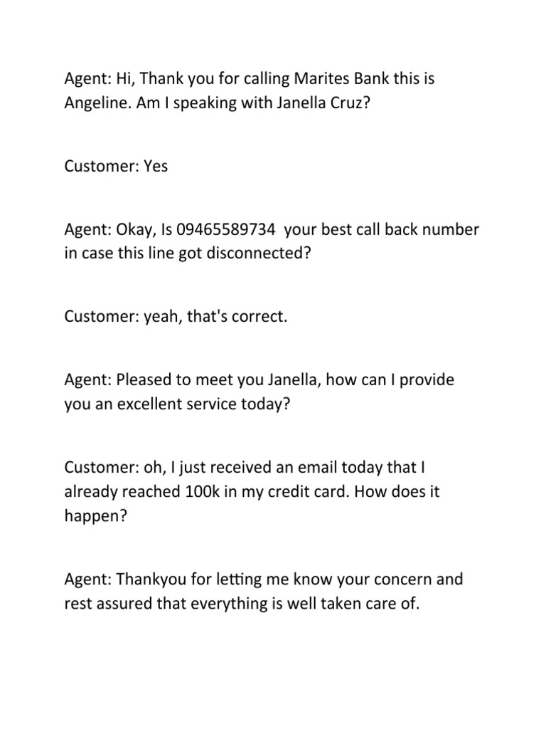 Agent: Hi, Janella. This is Angeline from Marites Bank.