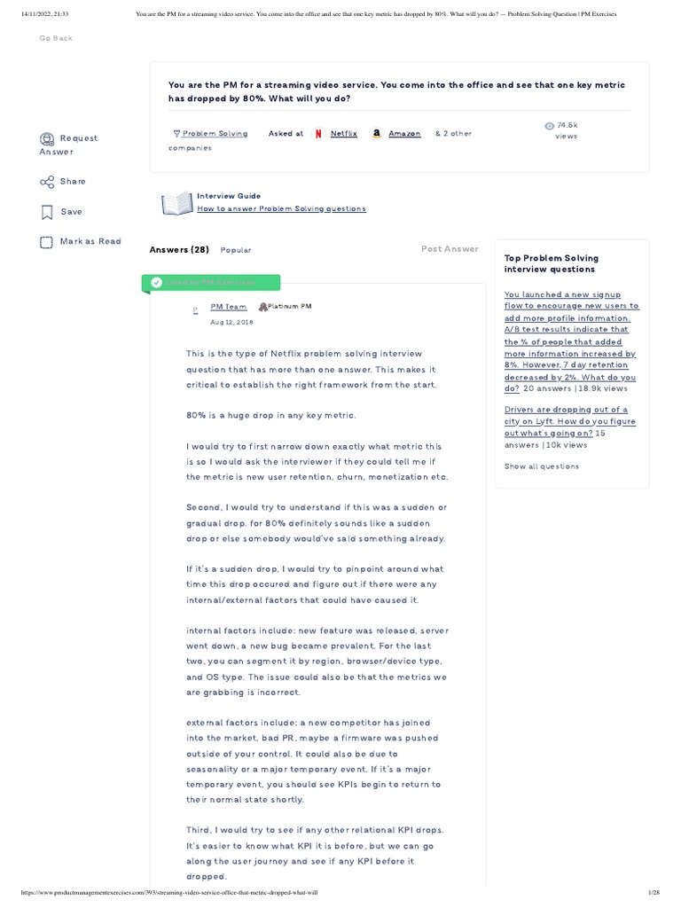 14/11/2022, 21:33 You are the PM for a streaming video service. You come into the office and see that one key metric has dropped by 80%. What will you do? — Problem Solving Question | PM Exercises