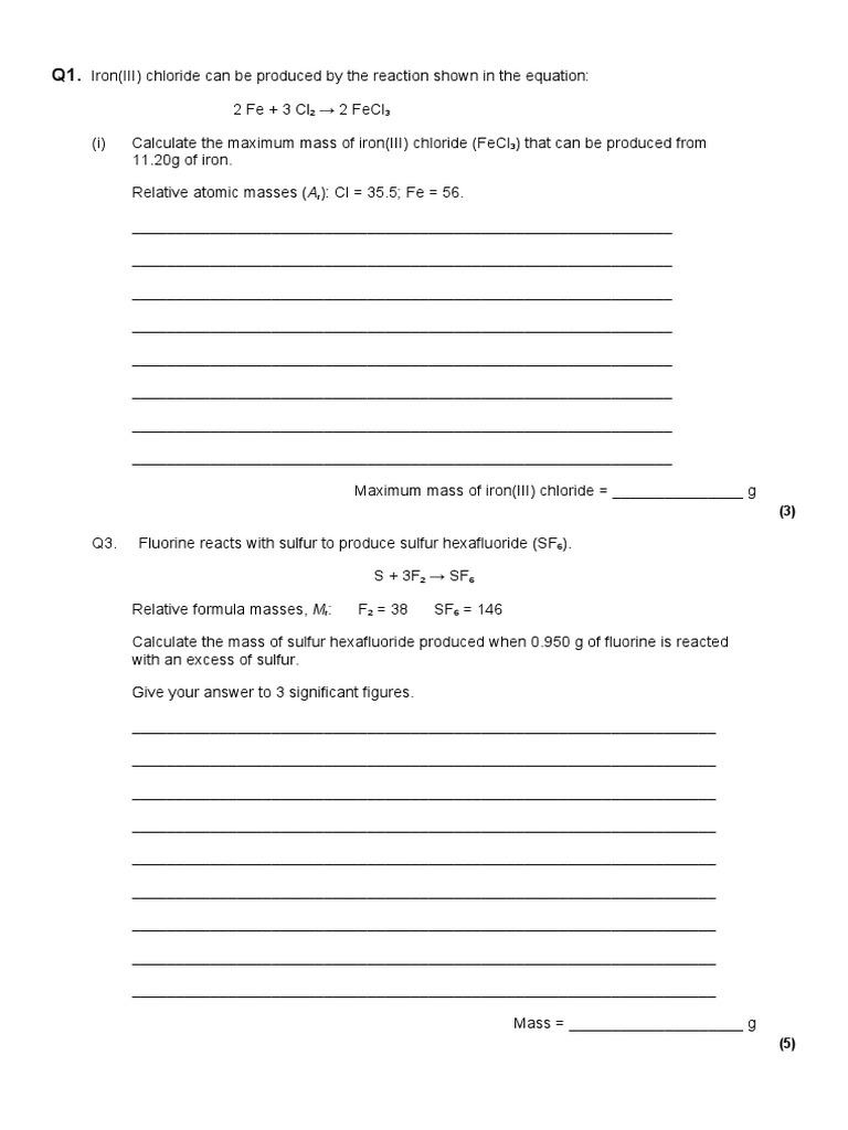 (i) Calculate the maximum mass of iron(III) chloride (FeCl3) that can be produced from