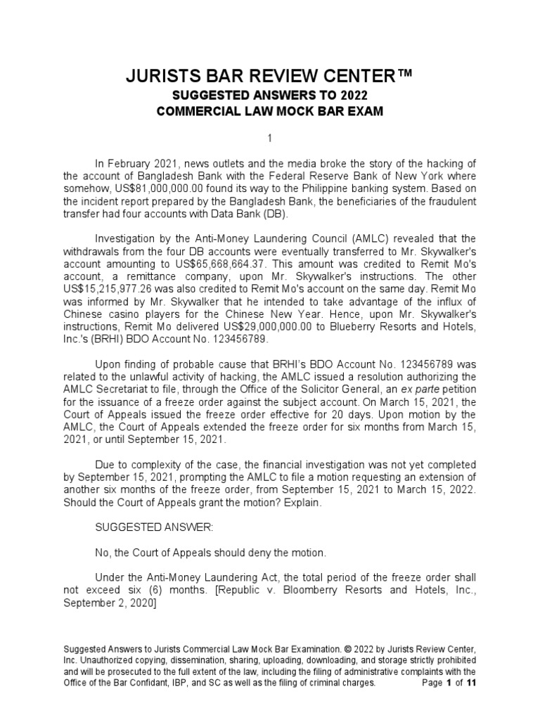 Suggested Answers to Jurists Commercial Law Mock Bar Examination. © 2022 by Jurists Review Center,