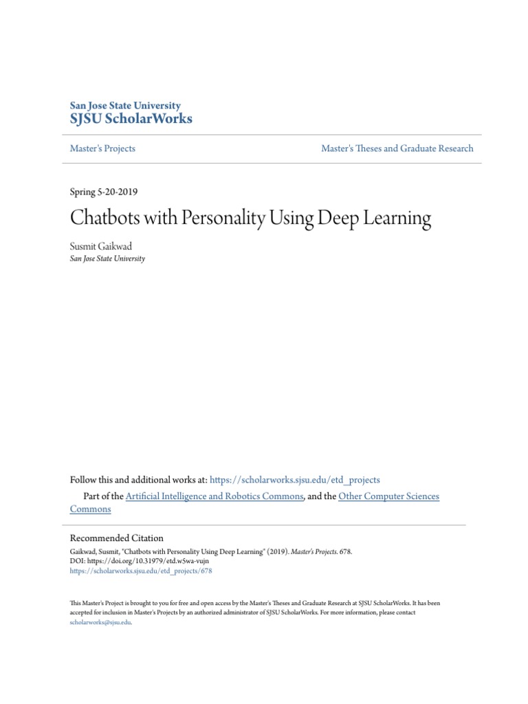 Gaikwad, Susmit, "Chatbots with Personality Using Deep Learning" (2019). Master's Projects. 678.