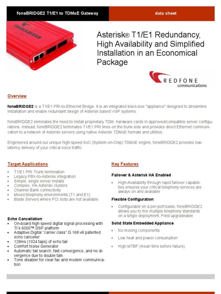 foneBRIDGE2 is a T1/E1 PRI-to-Ethernet Bridge. It is an integrated black-box "appliance" designed to streamline installation and enable redundant design of Asterisk based VoIP systems. foneBRIDGE2 eliminates the need to install proprietary TDM hardware cards in approved/compatible server configurations. Instead, foneBRIDGE2 terminates T1/E1 PRI lines on the trunk side and provides direct Ethernet communication to a network of Asterisk servers using native Asterisk TDMoE formats and utilities. Engineered around our unique high-speed SoC (System-on-Chip) TDMoE engine, foneBRIDGE2 provides lowlatency delivery of your critical voice traffic.