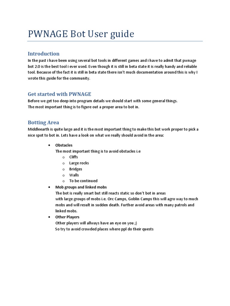 In the past i have been using several bot tools in different games and i have to admit that pwnage bot 2.0 is the best tool i ever used. Even though it is still in beta state it is really handy and reliable tool. Because of the fact it is still in beta state there isnt much documentation around this is why I wrote this guide for the community.