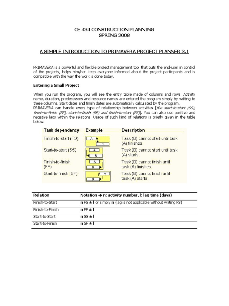 PRIMAVERA is a powerful and flexible project management tool that puts the end-user in control of the projects, helps him/her keep everyone informed about the project participants and is compatible with the way the work is done today. Entering a Small Project When you run the program, you will see the entry table made of columns and rows. Activity name, duration, predecessors and resource names are entered the program simply by writing to these columns. Start dates and finish dates are automatically calculated by the program. PRIMAVERA can handle every type of relationship between activities [like start-to-start (SS), finish-to-finish (FF), start-to-finish (SF) and finish-to-start (FS)]. You can also use positive and negative lags within the relations. Usage of such kind of relations is briefly given in the table below.
