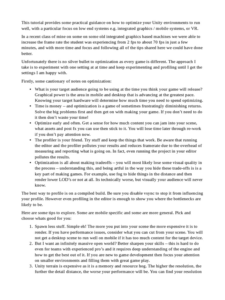 This tutorial provides some practical guidance on how to optimize your Unity environments to run