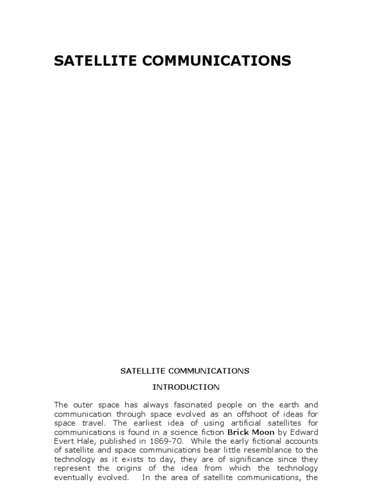 SATELLITE COMMUNICATIONS INTRODUCTION The outer space has always fascinated people on the earth and communication through space evolved as an offshoot of ideas for space travel. The earliest idea of using artificial satellites for communications is found in a science fiction Brick Moon by Edward Evert Hale, published in 1869-70. While the early fictional accounts of satellite and space communications bear little resemblance to the technology as it exists to day, they are of significance since they represent the origins of the idea from which the technology eventually evolved. In the area of satellite communications, the