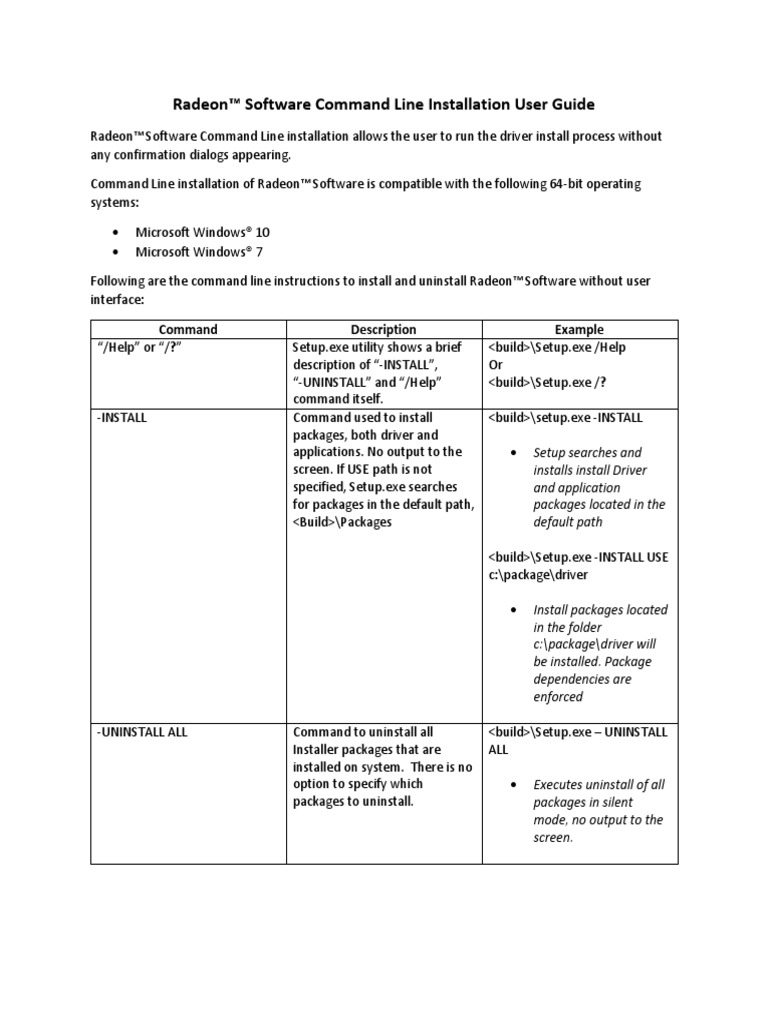 Radeon™ Software Command Line installation allows the user to run the driver install process without