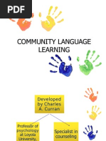 students were to be thought of as "clients" - their needs being addressed by a "councelor" in the form of the teacher. Brown (1994:59), in commenting on this approach also notes that "In order for any learning to take place ... what is first needed is for the members to interact in an interpersonal relationship in which students and teacher join together to facilitate learning in a context of valuing and prizing each indiviual in the group." Curran was best known for his extensive studies on adult learning, and some of the issues he tried to address were the threatening nature of a new learning situation to many adult learners and the anxiety created when students feared making "fools" of themselves. Curran believed that the councelinglearning model would help lower the instinctive defenses adult learners throw up, that the anxiety caused by the educational context could be decreased through the support of an interactive community of fellow learners. Another important goal was for the teacher to be perceived as an empathetic helping agent in the learning process, not a threat. The Counceling-Learning educational model was also applied to language learning, and in this form it became known as Community Language Learning. Based on most of the principles above, Community Language Learning seeks to encourage teachers to see their students as "whole" persons, where their feelings, intellect, interpersonal relationships, protective reactions, and desire to learn are addressed and balanced. Students typically sit in a circle, with the teacher (as councelor) outside the ring. They use their first language to develop an interpersonal relationship based on trust with the other students. When a student wants to say something, they first say it in their native language, which the teacher then translates back to them using the target language. The student then attempts to repeat the English used by the teacher, and then a student can respond using the same process. This technique is used over a considerable period of time, until students are able to apply words in the new language without translation, gradually moving from a situtation of dependence on the teacher-councelor to a state of independence. Objectives The Community Language Learning method does not just attempt to teach students how to use another language communicatively, it also tries to encourage the students to take increasingly more responsibility for their own learning, and to "learn about their learning", so to speak. Learning in a nondefensive manner is considered to be very important, with teacher and student regarding each other as a "whole person" where intellect and ability are not separated from feelings. The initial struggles with learning the new language are addressed by creating an environment of mutual support, trust and understanding between both learner-clients and the teacher-councelor. Key Features The Community Language Learning method involves some of the following features: (1) Students are to be considered as "learner-clients" and the teacher as a "teacher-councelor". (2) A relationship of mutual trust and support is considered essential to the learning process. (3) Students are permitted to use their native language, and are provided with translations from the teacher which they then attempt to apply. (4) Grammar and vocabulary are taught inductively.