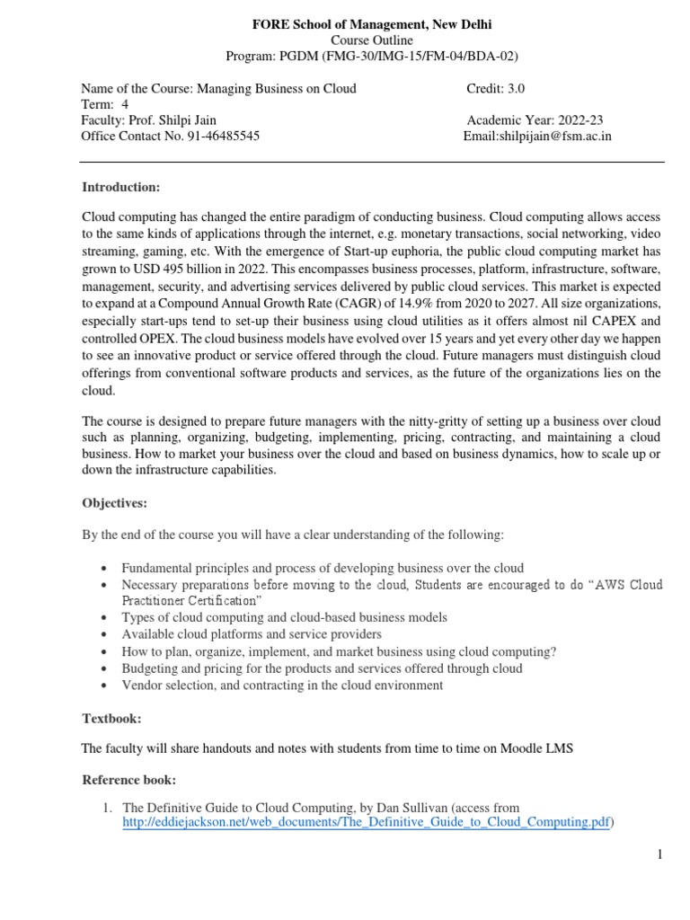 The course is designed to prepare future managers with the nitty-gritty of setting up a business over cloud