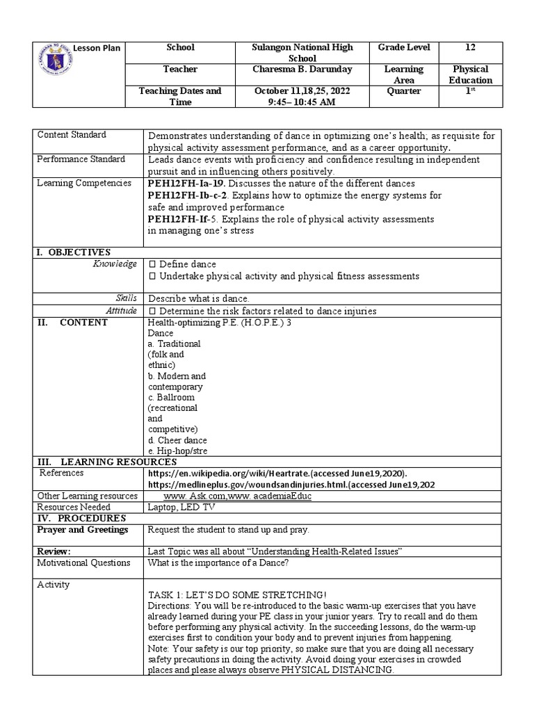 Learning Competencies PEH12FH-Ia-19. Discusses the nature of the different dances