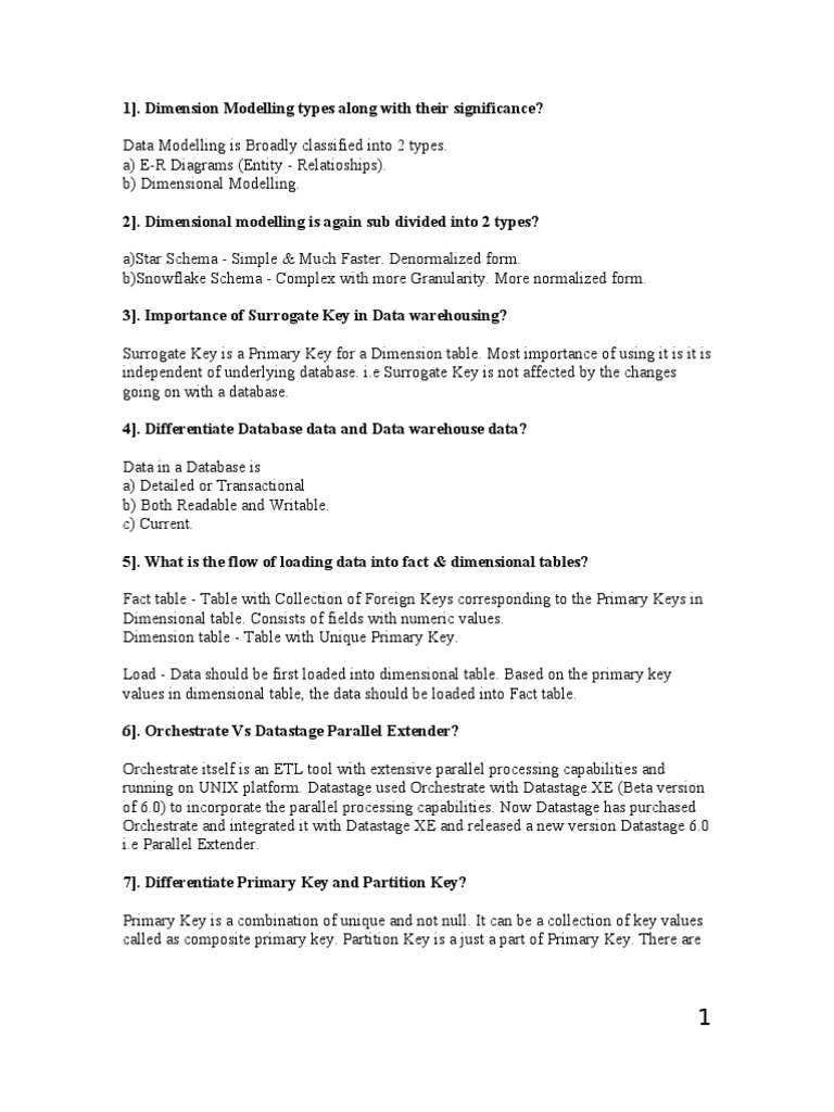 a) E-R Diagrams (Entity - Relatioships). b) Dimensional Modelling. 2]. Dimensional modelling is again sub divided into 2 types? a)Star Schema - Simple & Much Faster. Denormalized form. b)Snowflake Schema - Complex with more Granularity. More normalized form. 3]. Importance of Surrogate Key in Data warehousing? Surrogate Key is a Primary Key for a Dimension table. Most importance of using it is it is independent of underlying database. i.e Surrogate Key is not affected by the changes going on with a database. 4]. Differentiate Database data and Data warehouse data? Data in a Database is a) Detailed or Transactional b) Both Readable and Writable. c) Current. 5]. What is the flow of loading data into fact & dimensional tables? Fact table - Table with Collection of Foreign Keys corresponding to the Primary Keys in Dimensional table. Consists of fields with numeric values. Dimension table - Table with Unique Primary Key. Load - Data should be first loaded into dimensional table. Based on the primary key values in dimensional table, the data should be loaded into Fact table. 6]. Orchestrate Vs Datastage Parallel Extender? Orchestrate itself is an ETL tool with extensive parallel processing capabilities and running on UNIX platform. Datastage used Orchestrate with Datastage XE (Beta version of 6.0) to incorporate the parallel processing capabilities. Now Datastage has purchased Orchestrate and integrated it with Datastage XE and released a new version Datastage 6.0 i.e Parallel Extender. 7]. Differentiate Primary Key and Partition Key? Primary Key is a combination of unique and not null. It can be a collection of key values called as composite primary key. Partition Key is a just a part of Primary Key. There are