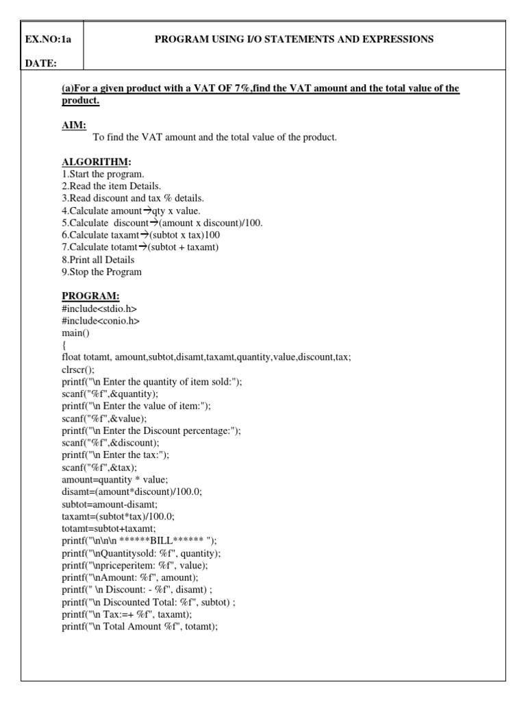 Thus the program for a given product with a VAT OF 7% to find the VAT Amount and