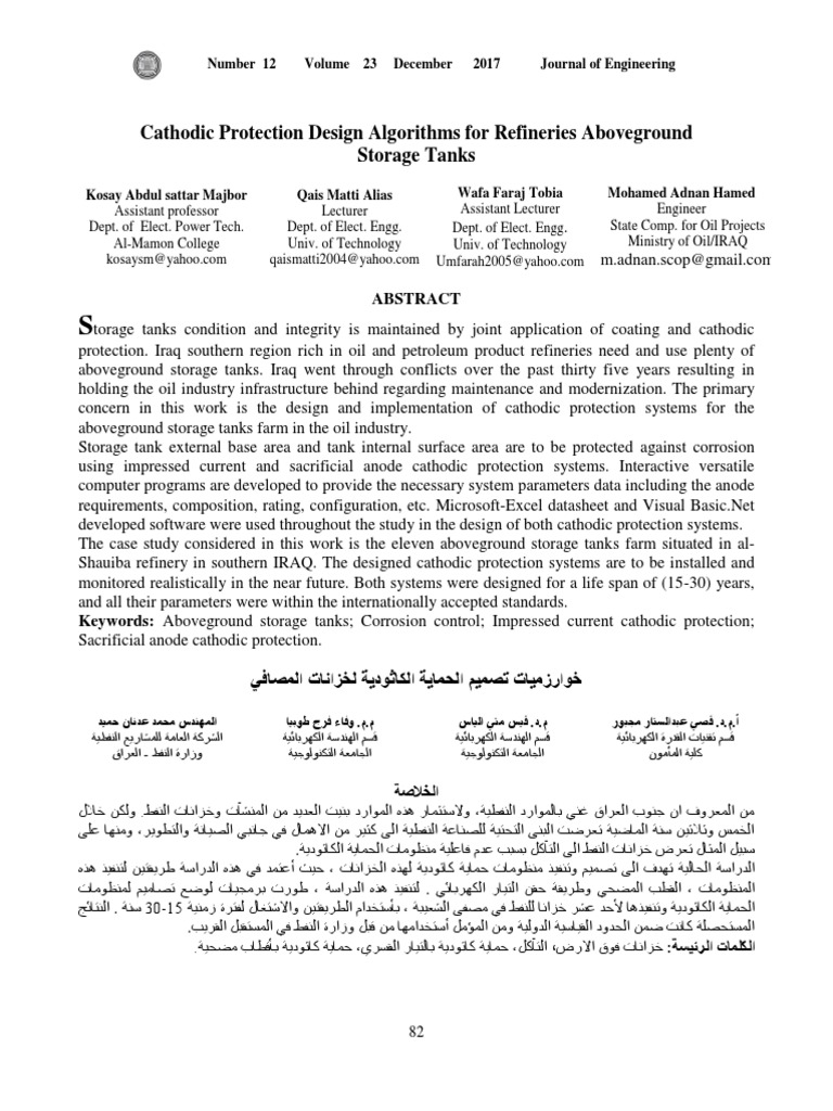Keywords: Aboveground storage tanks; Corrosion control; Impressed current cathodic protection;