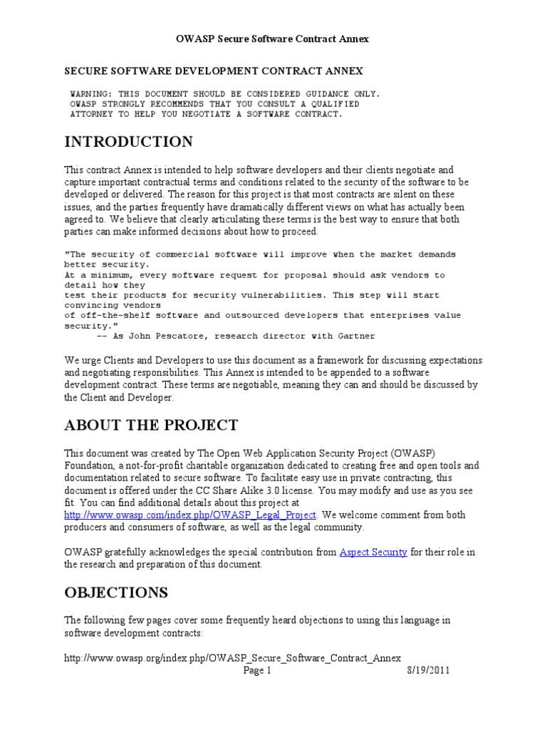 The following few pages cover some frequently heard objections to using this language in software development contracts: http://www.owasp.org/index.php/OWASP_Secure_Software_Contract_Annex Page 1 8/19/2011