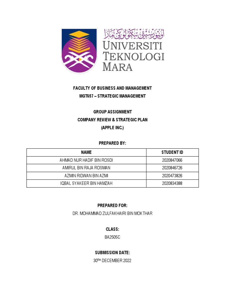 Second, we would like to express our gratitude to our MGT657 Strategic Management lecturer, Dr.