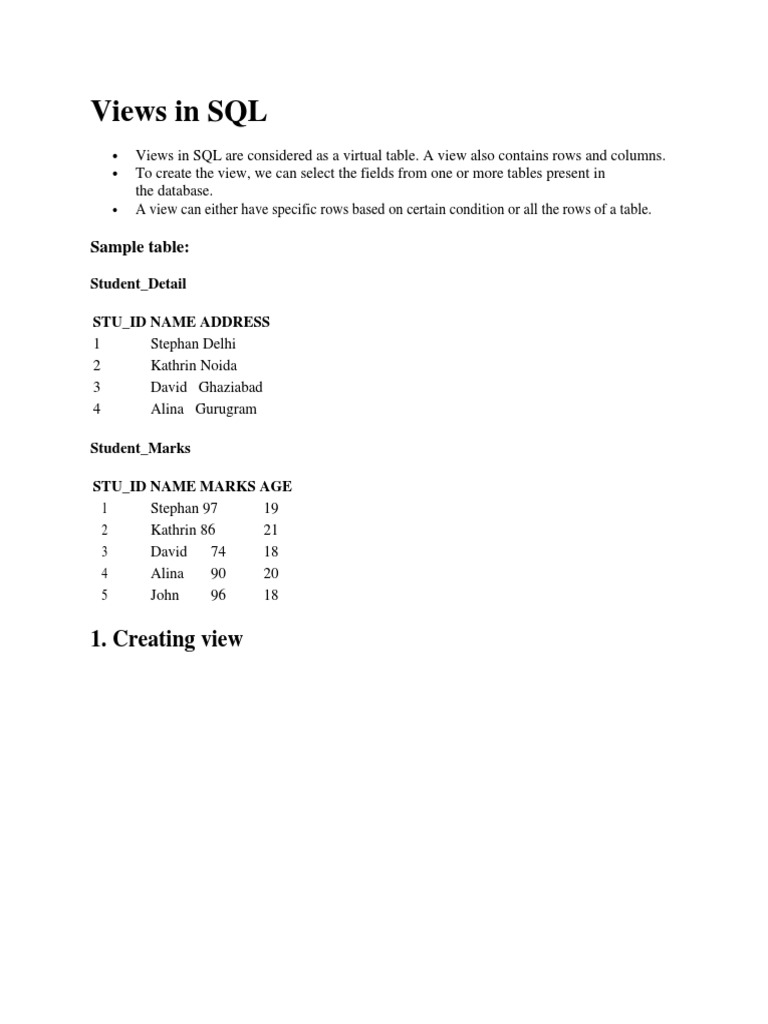 In the given example, a view is created named MarksView from two tables Student_Detail and