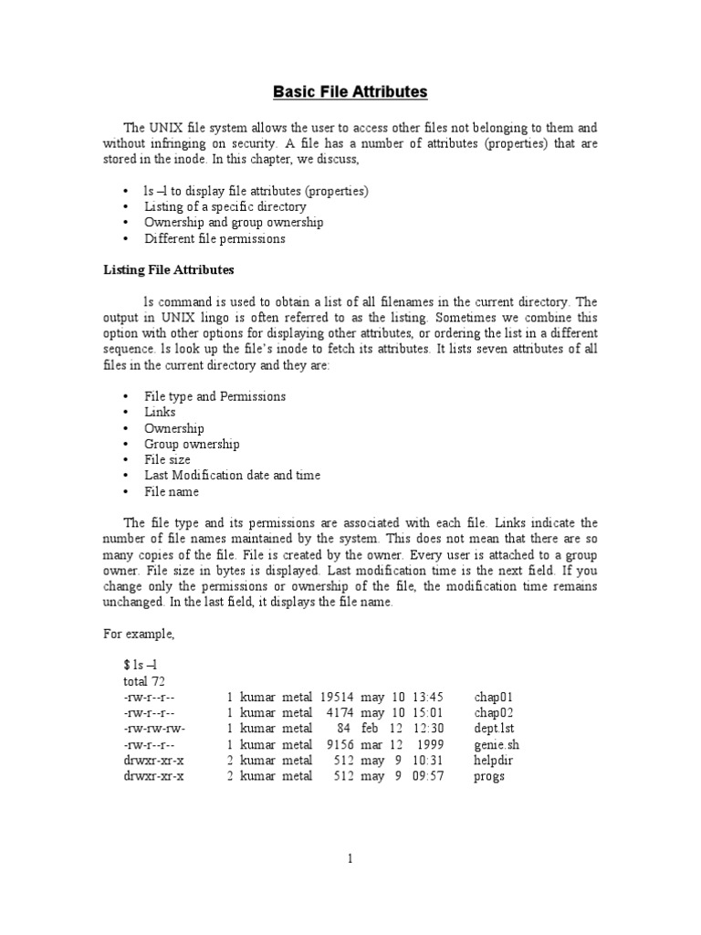 The UNIX file system allows the user to access other files not belonging to them and without infringing on security. A file has a number of attributes (properties) that are stored in the inode. In this chapter, we discuss, ls l to display file attributes (properties) Listing of a specific directory Ownership and group ownership Different file permissions