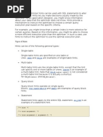 USE_NL The USE_NL hint causes Oracle to join each specified table to another row sour NO_USE_NL Do not use nested loop (from Oracle 10g) USE_NL_WITH_INDEXSpecifies a nested loops join. (from Oracle 10g) USE_MERGE The USE_MERGE hint causes Oracle to join each specified table with another r NO_USE_MERGE Do not use merge (from Oracle 10g) USE_HASH The USE_HASH hint causes Oracle to join each specified table with another row NO_USE_HASH Do not use hash (from Oracle 10g) Hints for Parallel Execution PARALLEL The PARALLEL hint allows you to specify the desired number of concurrent que NOPARALLEL / NO_PARALLEL The NOPARALLEL hint allows you to disable parallel scanning of a table, even i PQ_DISTRIBUTE The PQ_DISTRIBUTE hint improves the performance of parallel join operations. NO_PARALLEL_INDEXThe NO_PARALLEL_INDEX hint overrides a PARALLEL attribute setting on an Additional Hints APPEND When the APPEND hint is used with the INSERT statement, data is appended to NOAPPEND Overrides the append mode. CACHE The CACHE hint specifies that the blocks retrieved for the table in the hint are pl NOCACHE The NOCACHE hint specifies that the blocks retrieved for this table are placed a PUSH_PRED The PUSH_PRED hint forces pushing of a join predicate into the view. NO_PUSH_PRED The NO_PUSH_PRED hint prevents pushing of a join predicate into the view. PUSH_SUBQ The PUSH_SUBQ hint causes nonmerged subqueries to be evaluated at the ea NO_PUSH_SUBQ The NO_PUSH_SUBQ hint causes non-merged subqueries to be evaluated as t QB_NAME Specifies a name for a query block. (from Oracle 10g) CURSOR_SHARING_EXACT can replace literals in SQL statements with bind variables, if it is safe to d Oracle DRIVING_SITE The DRIVING_SITE hint forces query execution to be done for the table at a diff DYNAMIC_SAMPLING The DYNAMIC_SAMPLING hint lets you control dynamic sampling to improve s SPREAD_MIN_ANALYSIS hint omits some of the compile time optimizations of the rules, mainly detail This Hints with unknown status MERGE_AJ The MERGE_AJ hint transforms a NOT IN subquery into a merge anti-join to ac AND_EQUAL The AND_EQUAL hint explicitly chooses an execution plan that uses an access