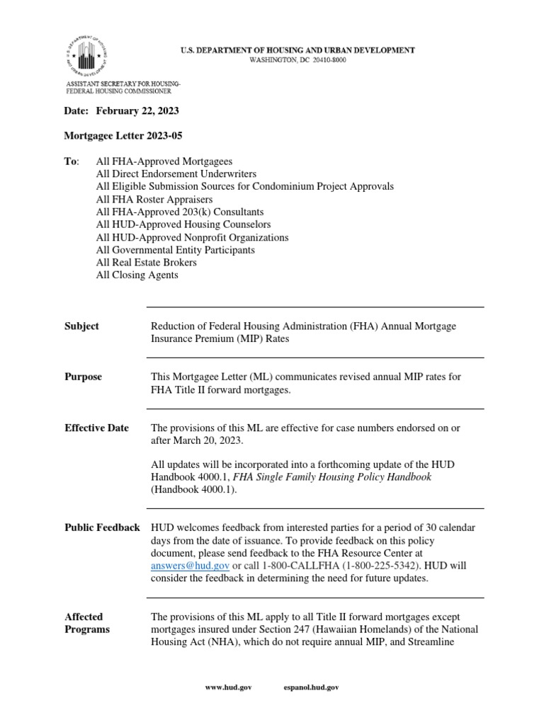 Purpose This Mortgagee Letter (ML) communicates revised annual MIP rates for