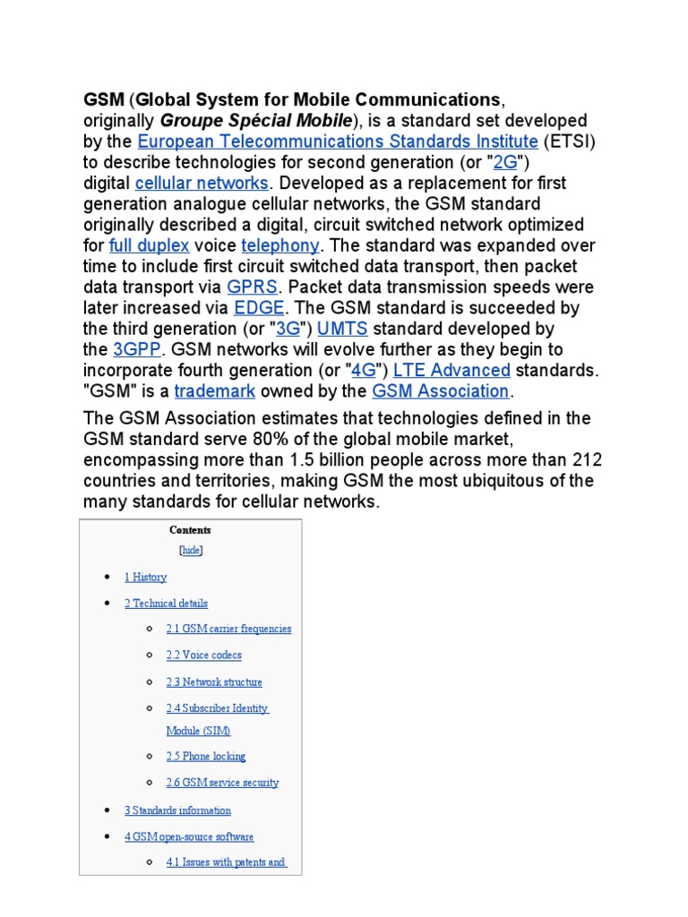GSM (Global System for Mobile Communications, originally Groupe Spcial Mobile), is a standard set developed by the European