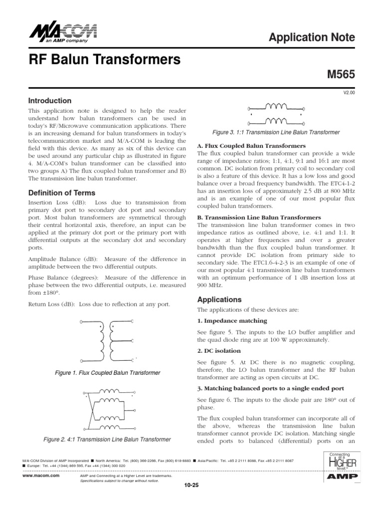 This application note is designed to help the reader understand how balun transformers can be used in todays RF/Microwave communication applications. There is an increasing demand for balun transformers in todays telecommunication market and M/A-COM is leading the eld with this device. As many as six of this device can be used around any particular chip as illustrated in gure 4. M/A-COMs balun transformer can be classied into two groups A) The ux coupled balun transformer and B) The transmission line balun transformer.