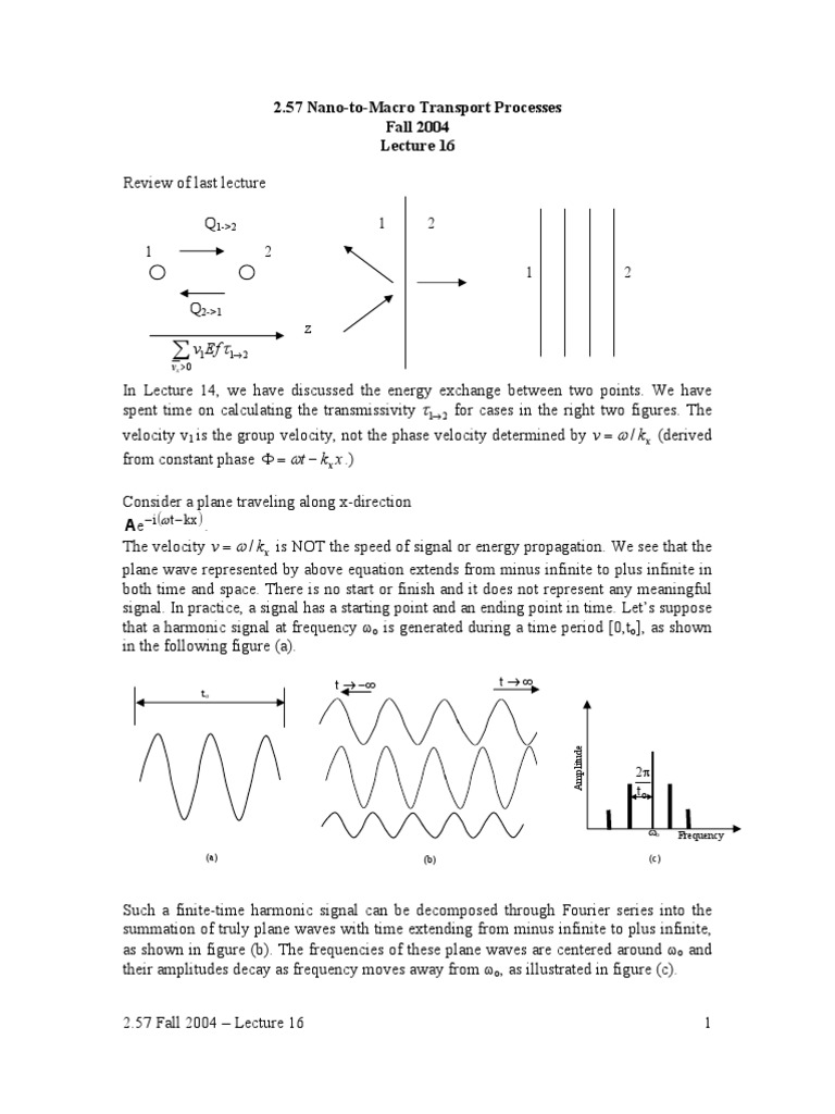 Such a finite-time harmonic signal can be decomposed through Fourier series into the summation of truly plane waves with time extending from minus infinite to plus infinite, as shown in figure (b). The frequencies of these plane waves are centered around o and their amplitudes decay as frequency moves away from o, as illustrated in figure (c). 2.57 Fall 2004 Lecture 16 1