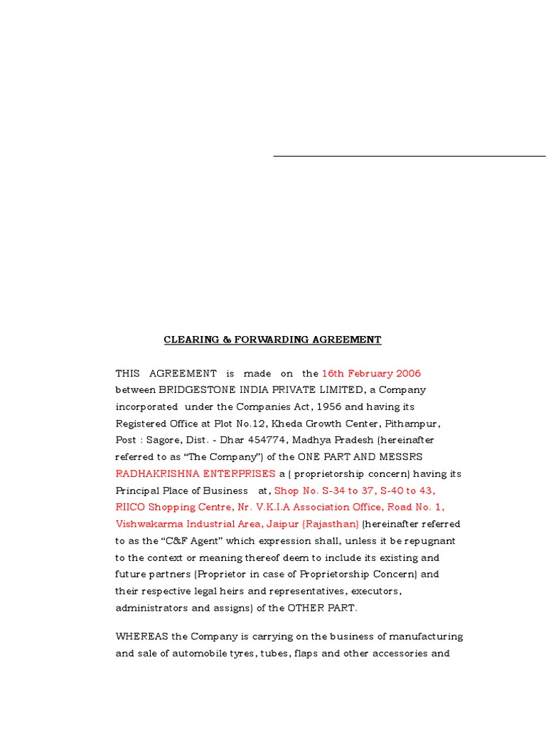 FOR C&F AGREEMENT BETWEEN BRIDGESTONE INDIA PRIVATE