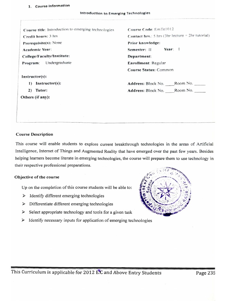 Credit hours: 3 hrs Contact hrs: 5 hrs (3hr lecture * 2hr tutorial)